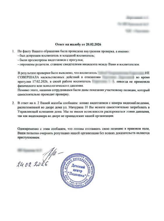 Женщина также рассказала, что люди из руководства детского сада «Ладошки» звонили ей с личного номера и говорили о нежелательности распространения информации об инциденте в интернете. Красноярке пригрозили судом и статьей 152 ГК РФ (защита чести, достоинства и деловой репутации), что она в свою очередь восприняла как попытку оказания давления.